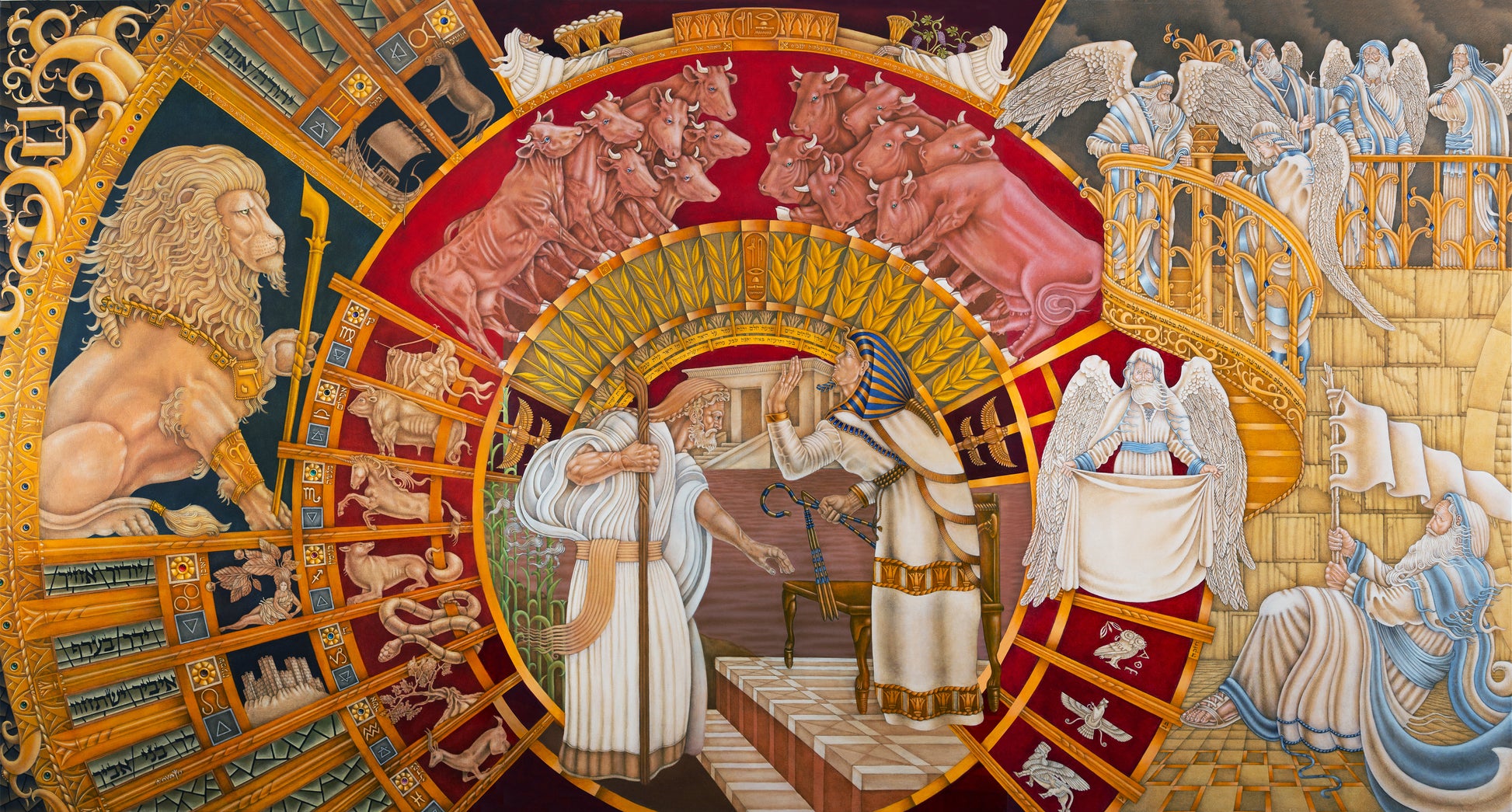 Below are the 7 skinny cows with Sapphire eyes, which represent the highest faith and the 7 fat cows with emerald eyes, (stones that represent abundance). Joseph raises his Vav-shaped staff with his right hand, (The right column in Kabbalah means "GIVE" and lowers his left, his ego). Pharaoh raises his left (The left column in Kabbalah means "receive").