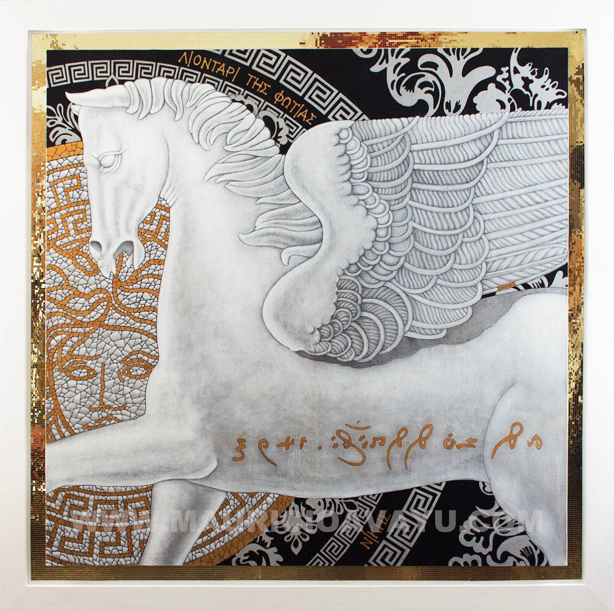 Mauricio Avayu's latest painting is an evocative masterpiece that seamlessly blends historical inspiration with contemporary elegance. Drawing from the grandeur of the Pegasus sculpture at Gulfstream in Miami and Leonardo da Vinci's ambitious design for the world's largest equine sculpture, Avayu creates a dynamic fusion of classical and modern elements.The painting features intricate Versace-inspired details, with the mythical Medusa subtly depicted in the background, symbolizing the story of Perseus and Pegasus. Avayu masterfully mimics the mosaic patterns reminiscent of the Versace mansion in Miami, adding layers of texture and depth to the composition.