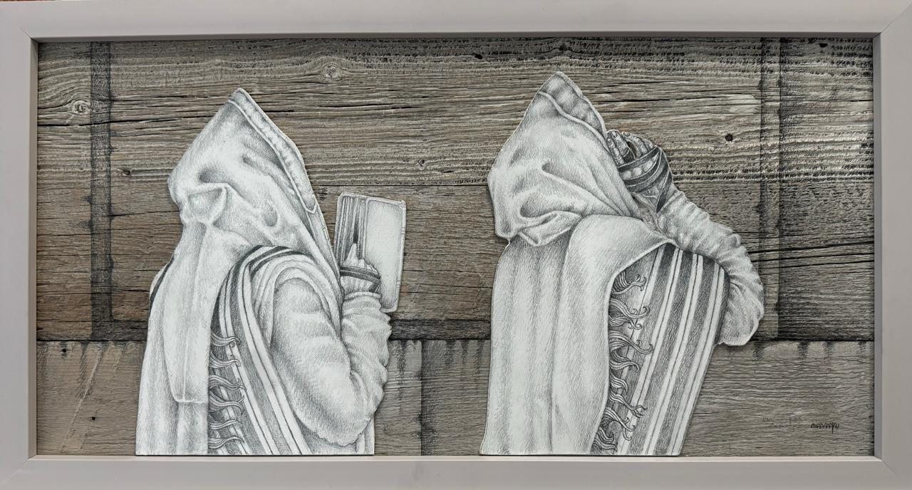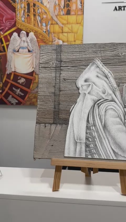 This piece, crafted on textured wood with characters in relief, captures two figures standing at the Kotel (Western Wall), each representing distinct spiritual attributes. The figure on the right embodies “Kindness” (Chesed) or unconditional love, symbolizing the first level of faith—pure and immaculate faith of the soul. Covered in a tallit, this figure appears to listen deeply, illustrating a receptive connection with divine energy.