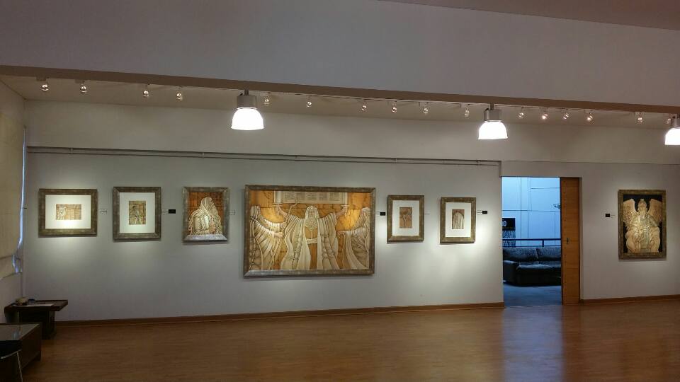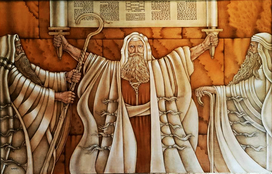 The timelessness of this work compels us to travel in time, showing us that the stories are repeated again and again in an endless cycle. It could reflect an image of today, as well as a key moment thousands of years ago. The Torah in its incalculable immensity, is responsible for divinely capturing situations that are engraved in the soul. Seeing these three characters immediately remind us of Moshe opening the sea and being only a channel for Gd to guide us, his ten tsit-tsit represent the ten commandments received. On the left side of the work we have Aaron, lifting and taking off his newly hatched almond tree personifying the shepherd and spiritual guide, he is the only one of the three with the Talit on his head. On the right is Medad, who is Comfortably supported by his stick connected with the earth symbol of materiality, hoping to be given that longed wisdom to be able to detach itself as the vine needs a tutor to be able to bear fruit, magically the folds of his robe outline a Menorah that is the symbol Of the people of Israel. The text written at the top of the book details faithfully and with obsessive perfection the five paragraphs of Beshalaj of the Biblical Exodus, which relate the departure of Egypt and the embrace of freedom ....